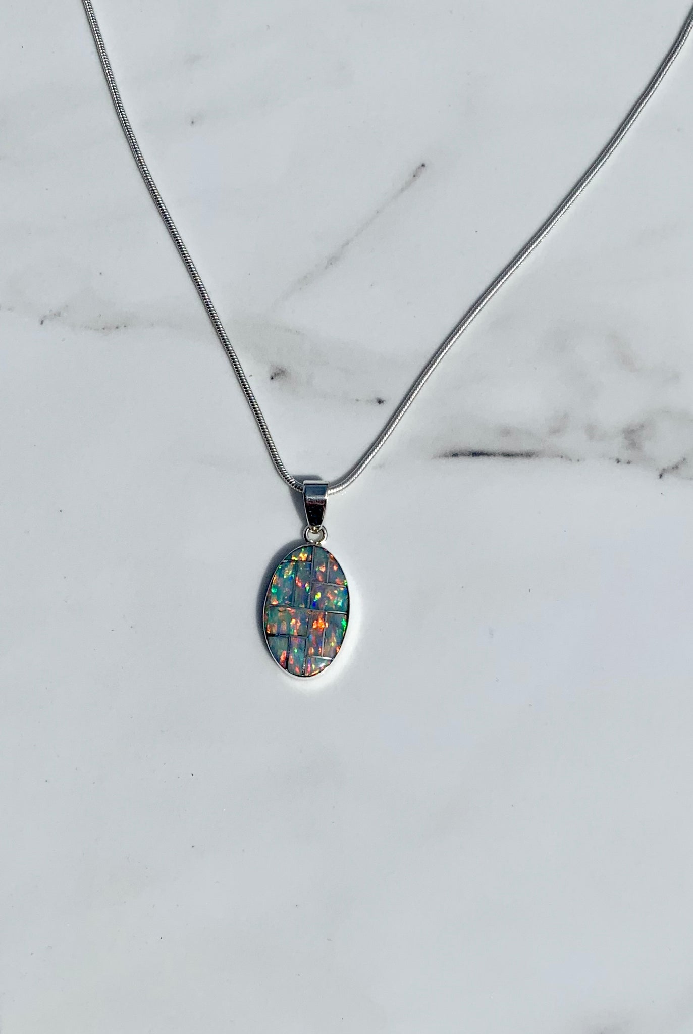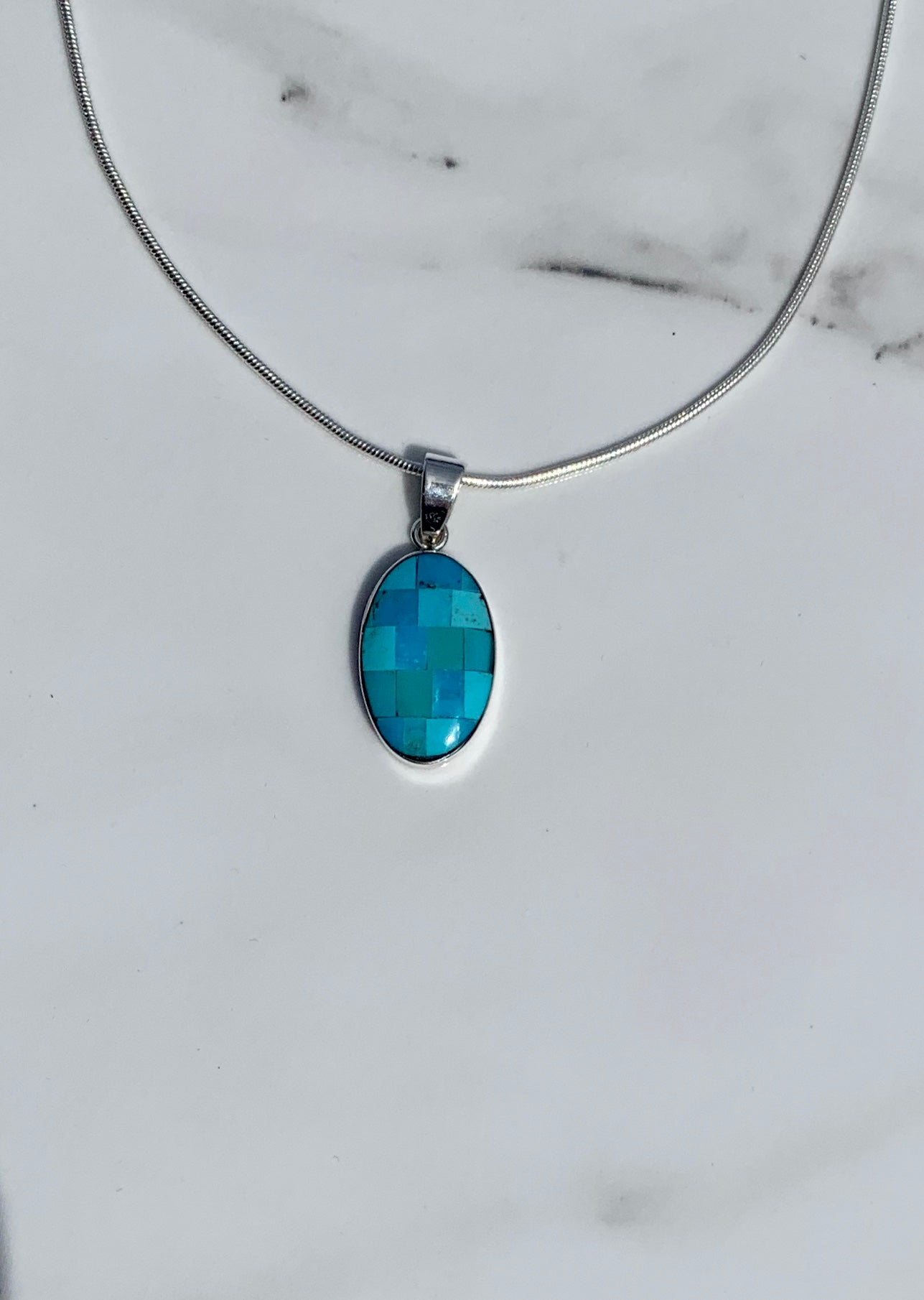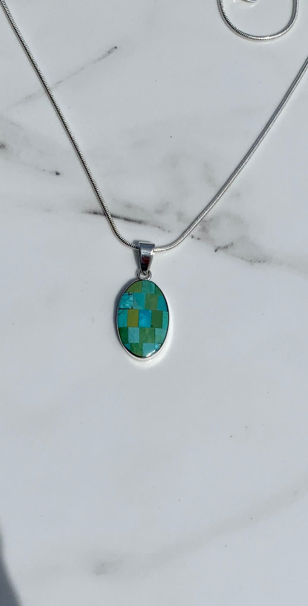 Stones: Lab Created Opal. Sleeping Beauty mixed with Kingman Turquoise mosaic style, Sleeping Beauty Turquoise from Globe, Arizona, Kingman Turquoise from Kingman, Arizona. Emerald Valley Turquoise mosaic style from Nevada.